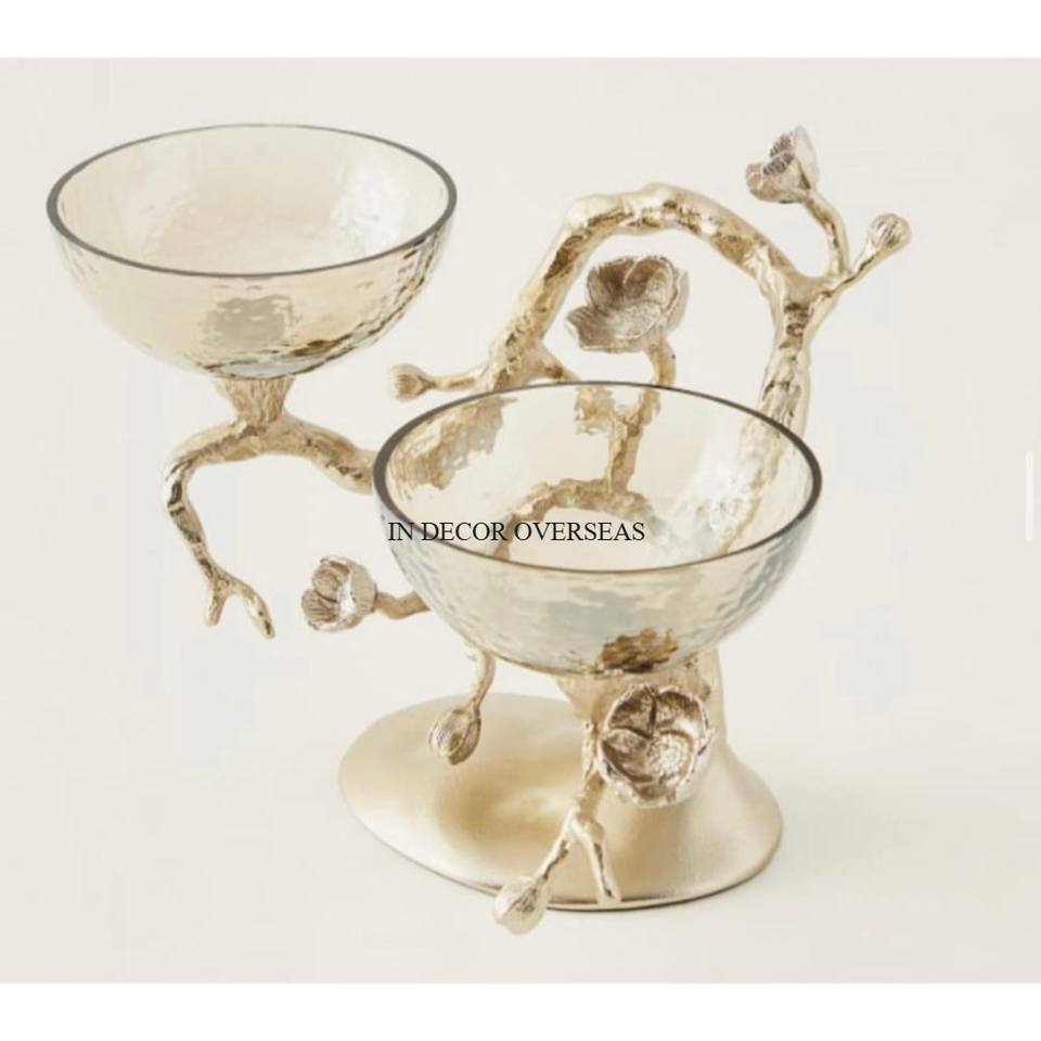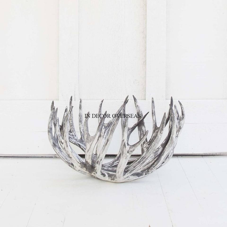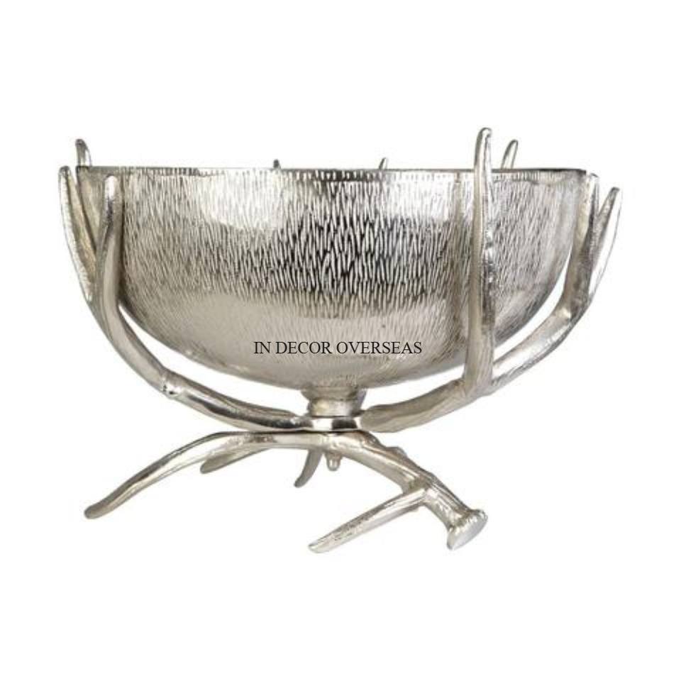 Fancy Unique Texture Designer Silver Color Finishing Shiny Polished Round Shape Metal Serving Bowl With Antler Designer Base
