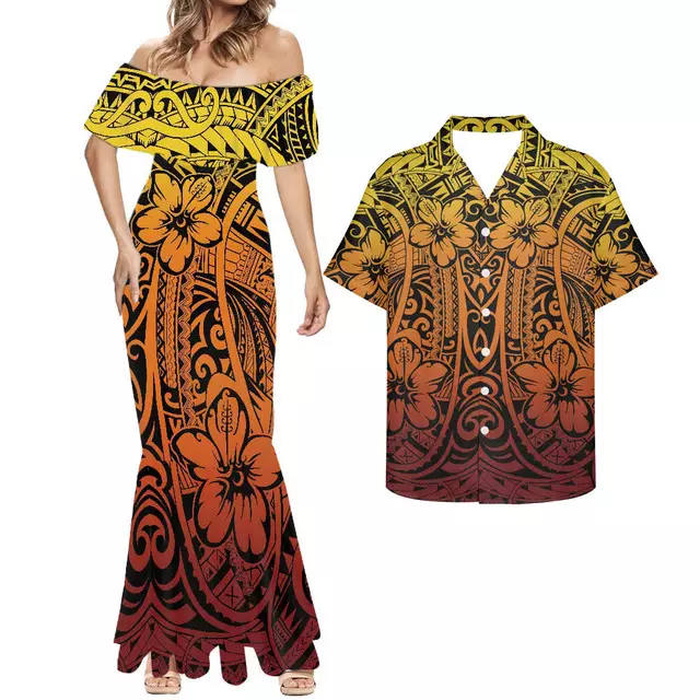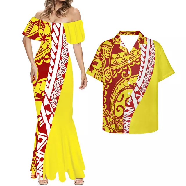 Fancy Yellow Hawaiian Dress Polynesian Tribal Samoan Pattern Couple Set New Holiday Dress for Women Elegant Party Bodycon Dress