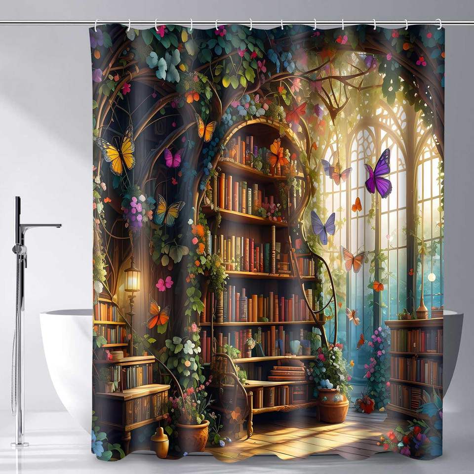 Fantasy Library Inspired Shower Curtain Water-Proof Custom Bath Home Decor Greenhouse Plant Flower Butterfly Bookshelf Green