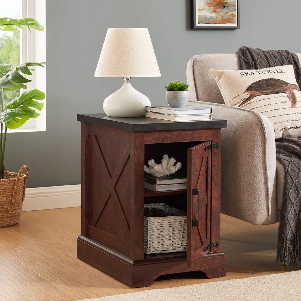 Farmhouse Rectangular End Table with Adjustable Storage Shelf and Rustic Barn Door Nightstand for Sofa Side Use