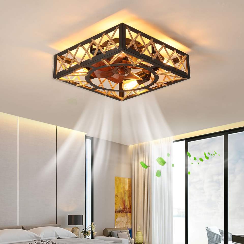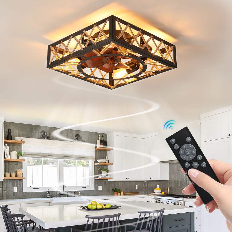 Farmhouse Rustic Ceiling Fan with Remote Control Square Caged Industrial Fixture 6 Speeds Noiseless DC Motor for Your Home