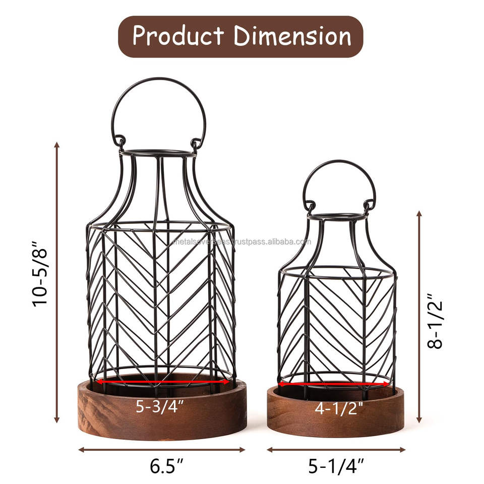 Farmhouse Style Wire Frame Lantern Pair Decorative Metal and Wood Candle Lanterns for Indoor Outdoor