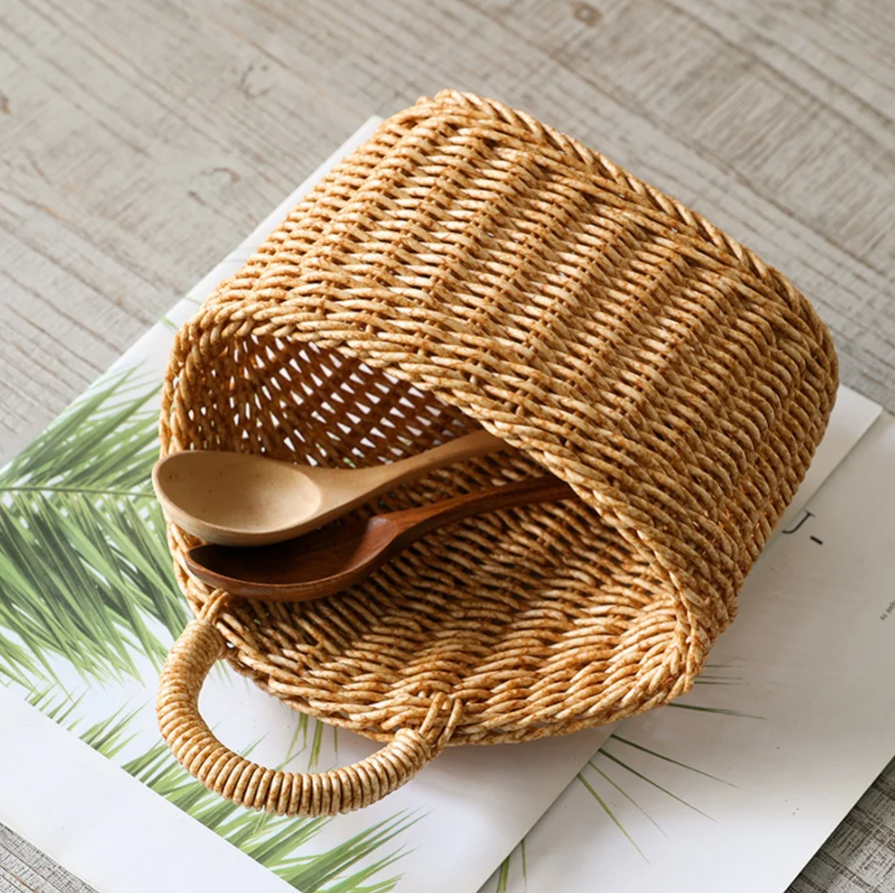 Farmhouse Woven Wall Hanging Storage Basket, Small Woven Basket Kitchen Wall Mount Organizer for Ginger Garlic Wall Basket