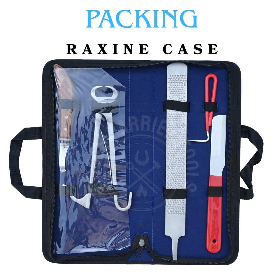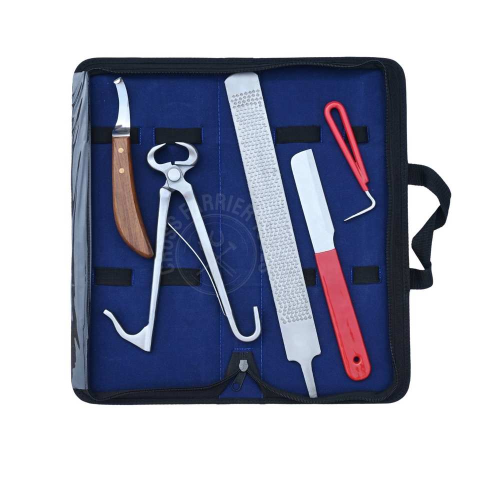 Farrier Tools Kit with Foal Hoof Nipper D Blade Hoof Knife Red Grip Non Slip Toeing Knife Rasp File & Hoof Pick in Rexine Case