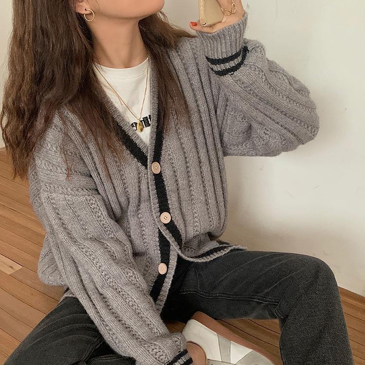 Women's Autumn Winter Fashion Cardigan Basic Knitted Top Button Long Sleeved Casual Sweater College Style Printed Silk Front