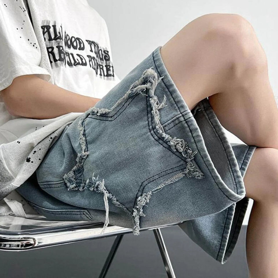 Fashion Denim Shorts For Men Summer Comfortable High Waist Drawstring Short Pants Men's Street Wear Star Loose Casual Shorts