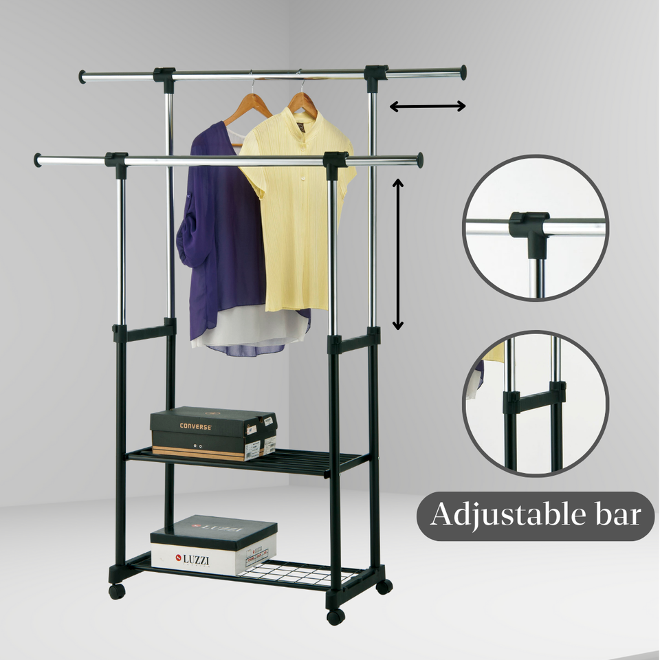 Fashion Design Double Bar Clothes Stand & Shoe Racks with Wheels Detachable Space-Saving Clothing Organizer