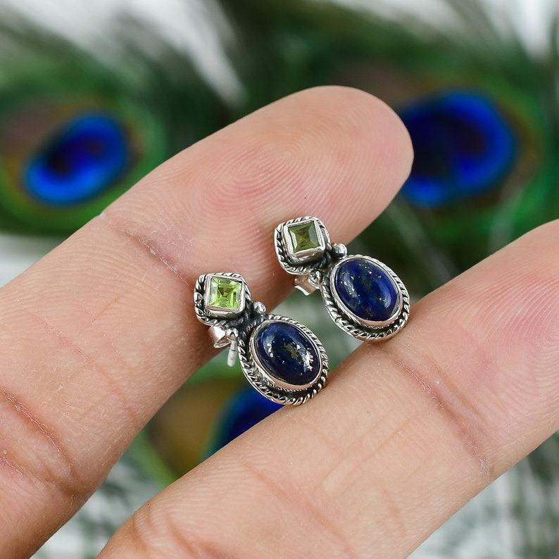 Fashion Design Lapis Gemstone Stud Earrings 925 Solid Sterling Silver Earrings for Women and Girls Stud Earrings Silver Jewelry