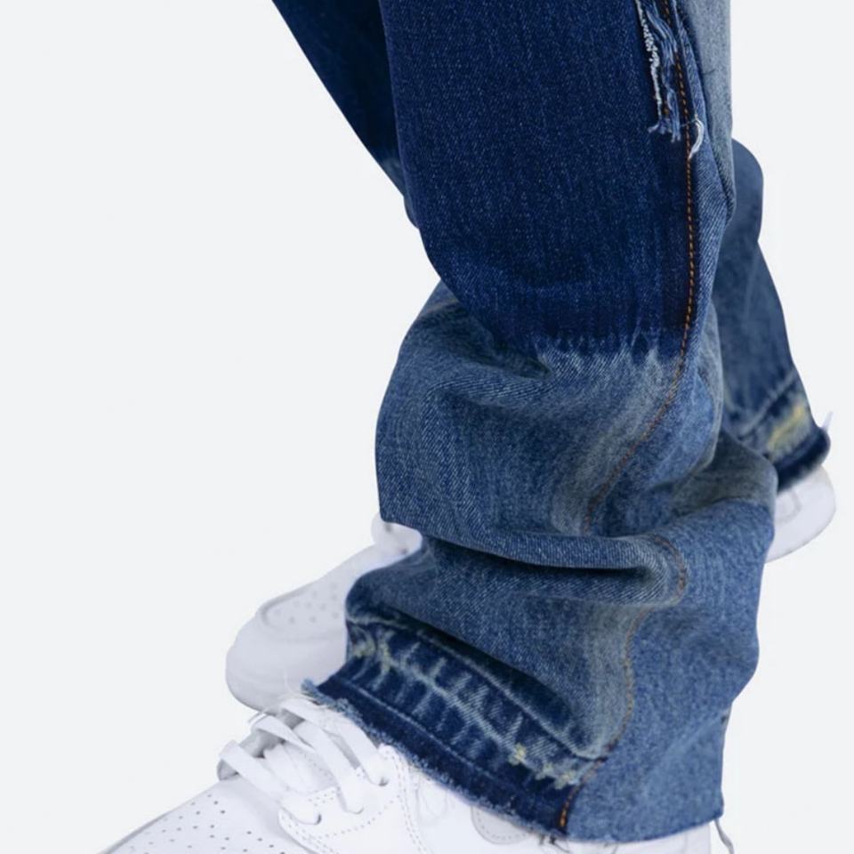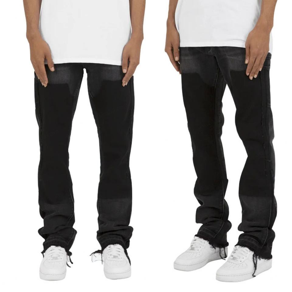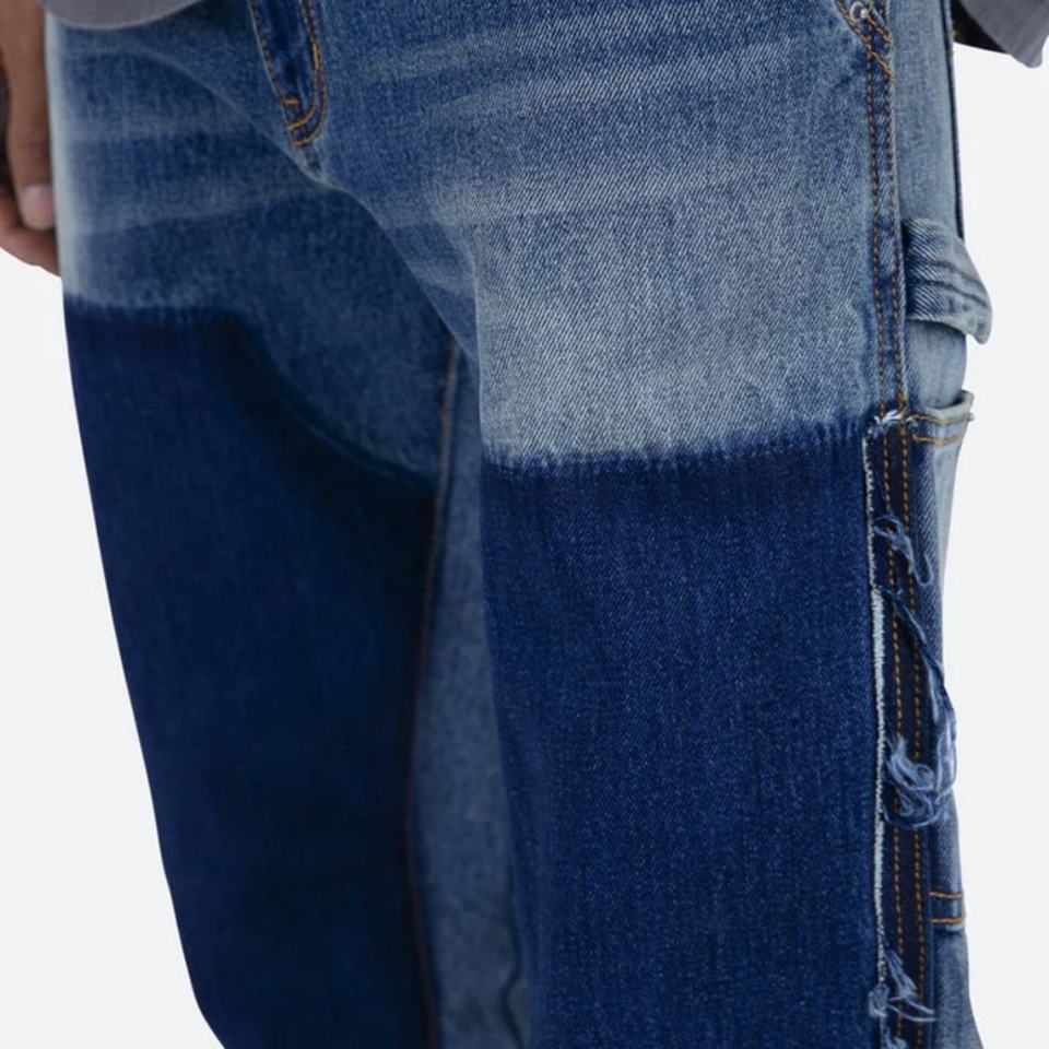 Fashion Designer Style Men's Clothing OEM Contrast Panel Stone Wash Raw Hem Baggy Work Flare Denim Jeans