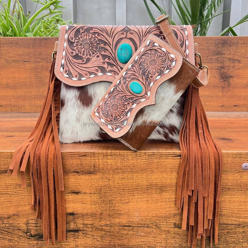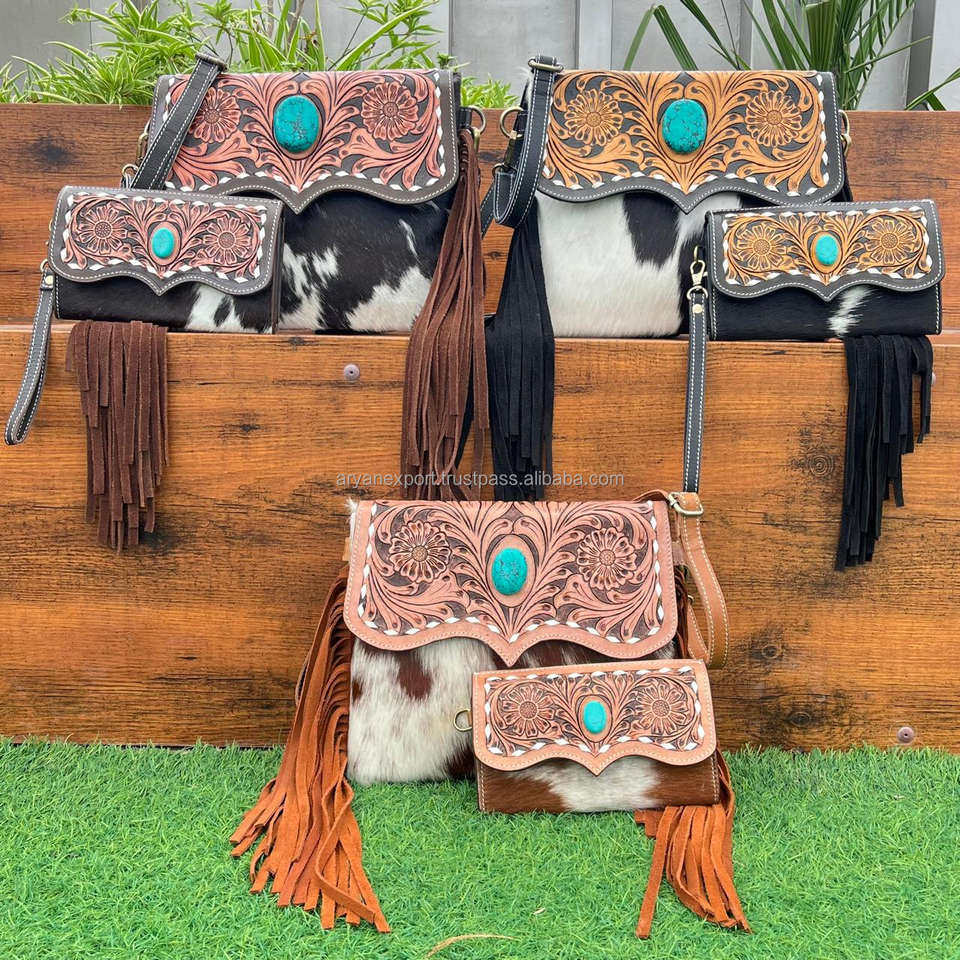 Fashion Elegant Hand Tooled Cowhide Leather Women's Crossbody Bags & Wristlet Clutch High Quality 2 Piece Combo Set for Women's
