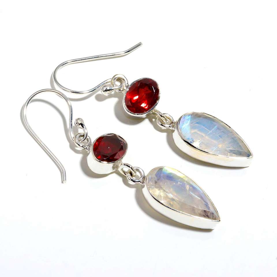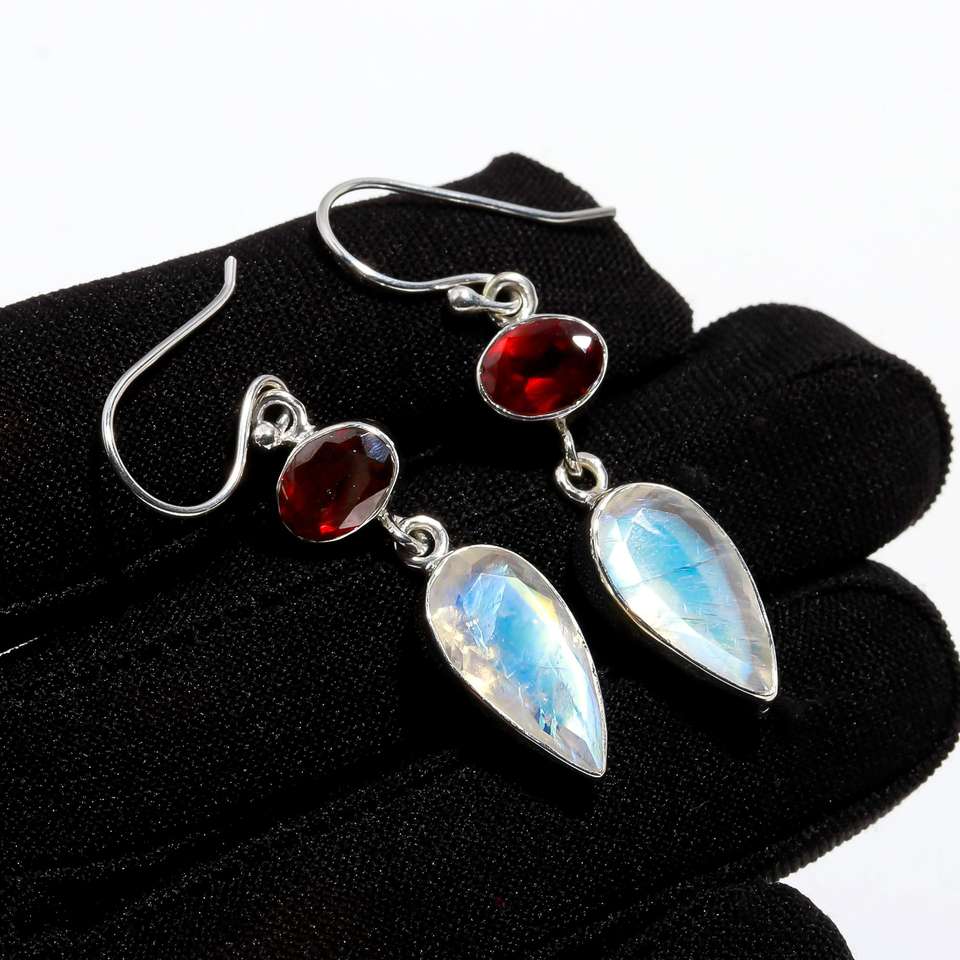 Fashion Girls Simple Rainbow Moonstone And Garnet Gemstone 925 Solid Sterling Silver Stone Earrings for Women Dangle Earrings