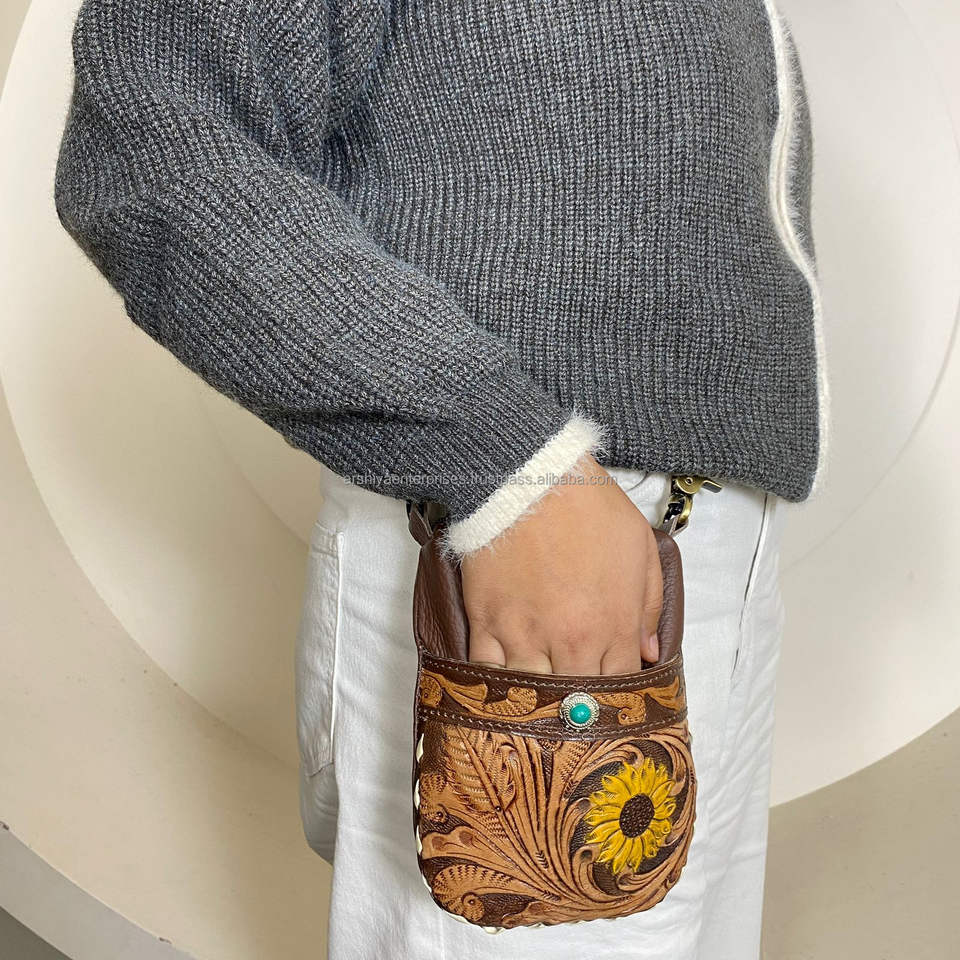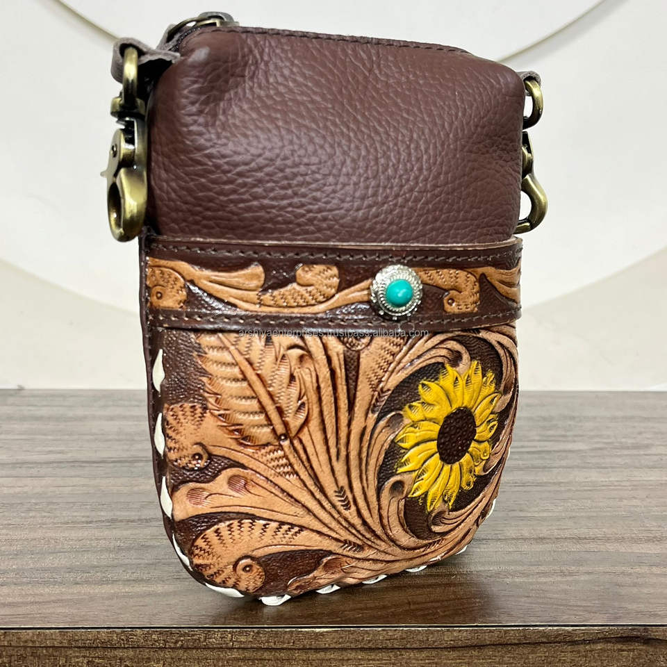 Fashion Hand Tooled Cow Leather Mobile Phone Bag Designer Turquoise Stone Accent & Floral Purse Multi-function Women's Waist Bag