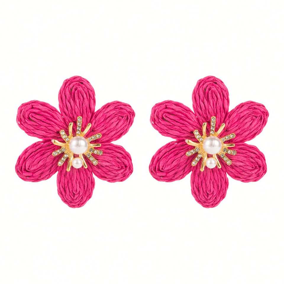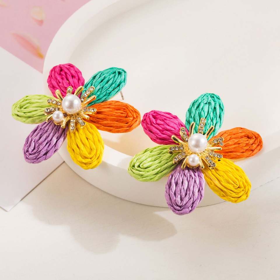 Fashion Hand-Woven Raffia Vacation Style Alloy Rhinestone Pearl Flower Ear Studs Earrings