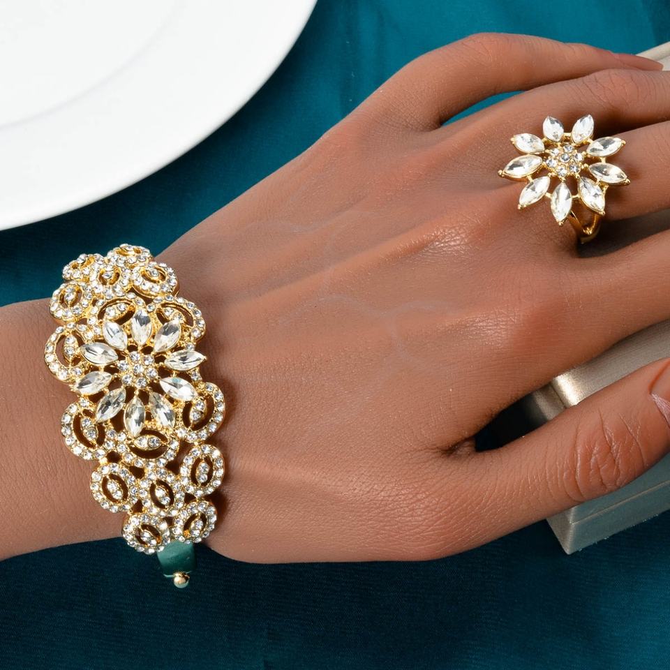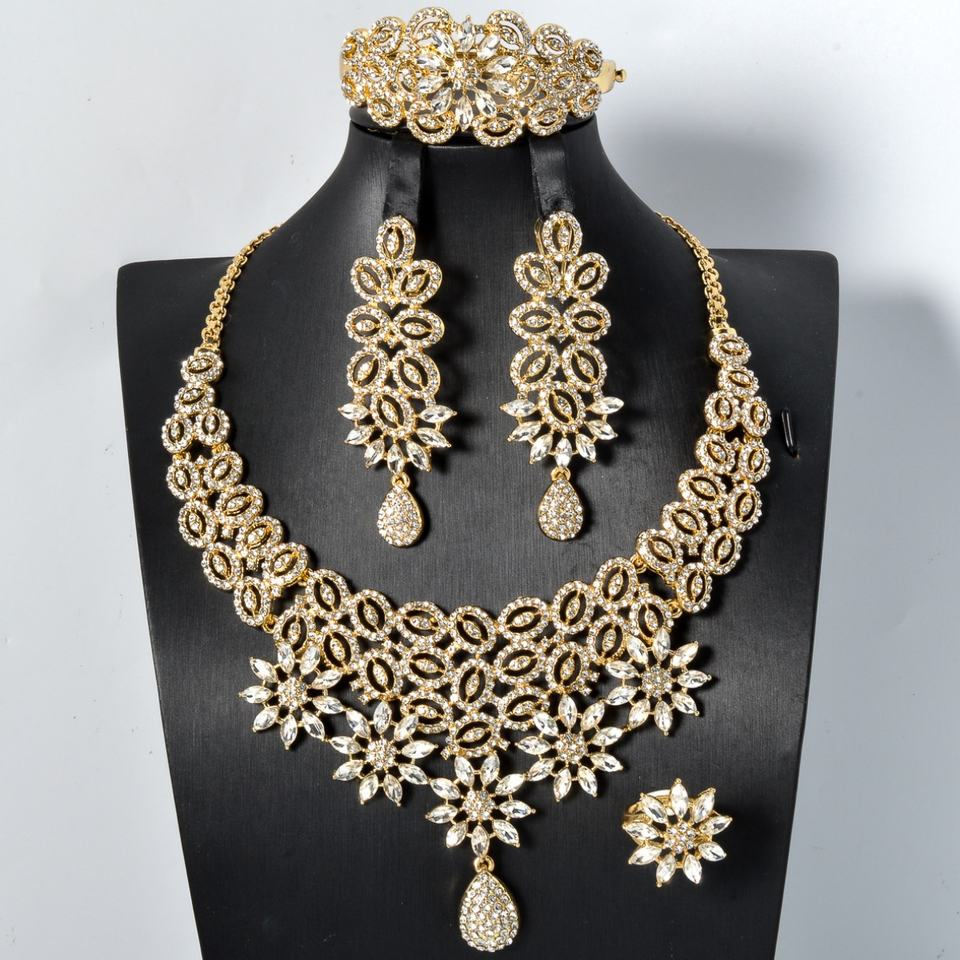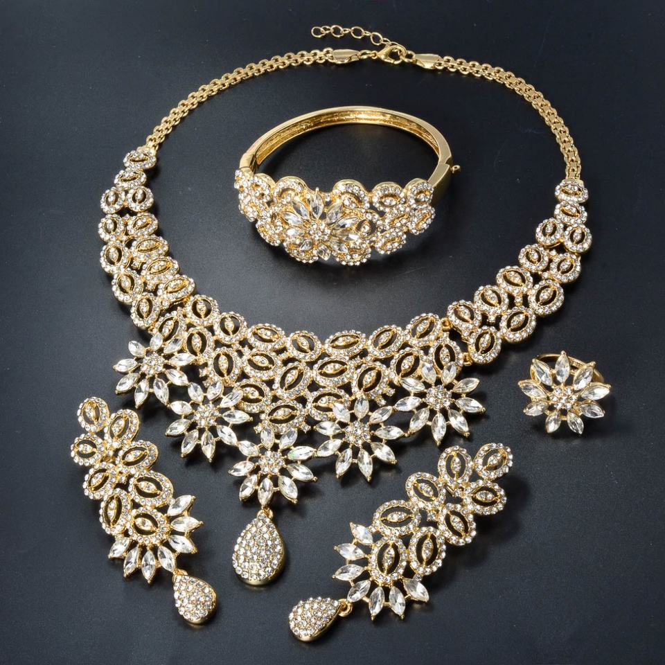 Fashion Jewelry Classic Party Bridal Zircon 14K Gold Plated Bracelet Ring Necklace Earring Women's Jewelry Sets