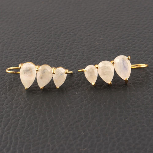 Fashion Jewelry Women Ear Climber Design Earring Pear Shape Natural Blue Fire Rainbow Moonstone Prong Gold Plated Diamond Pearl
