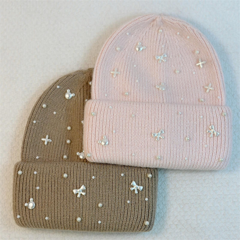 Fashion Knitted Beanie Hat with Crystal Rhinestone Embroidery Soft Warm Winter Hat for Women and Men