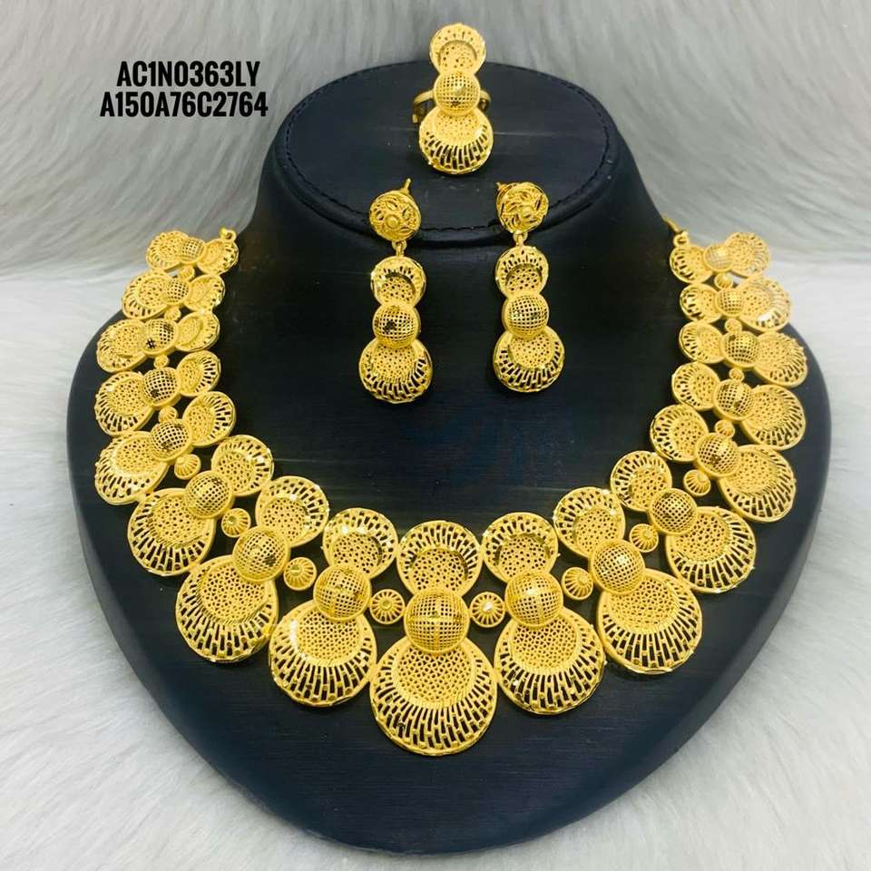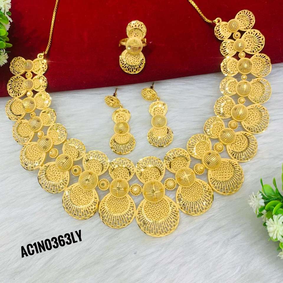 Fashion Latest Stylish Fancy Festive Wedding Party Short Necklace Set With Earrings & Rings 18K One Gram Gold Plated Jewellery