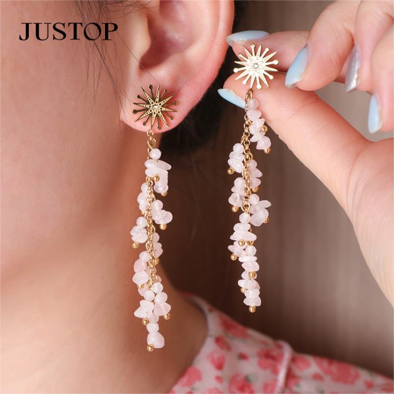 Fashion Long Natural Gemstone Agate Crushed Stone Tassel Earrings Stainless Steel Environmental Friendly 14K Gold Plated Unisex