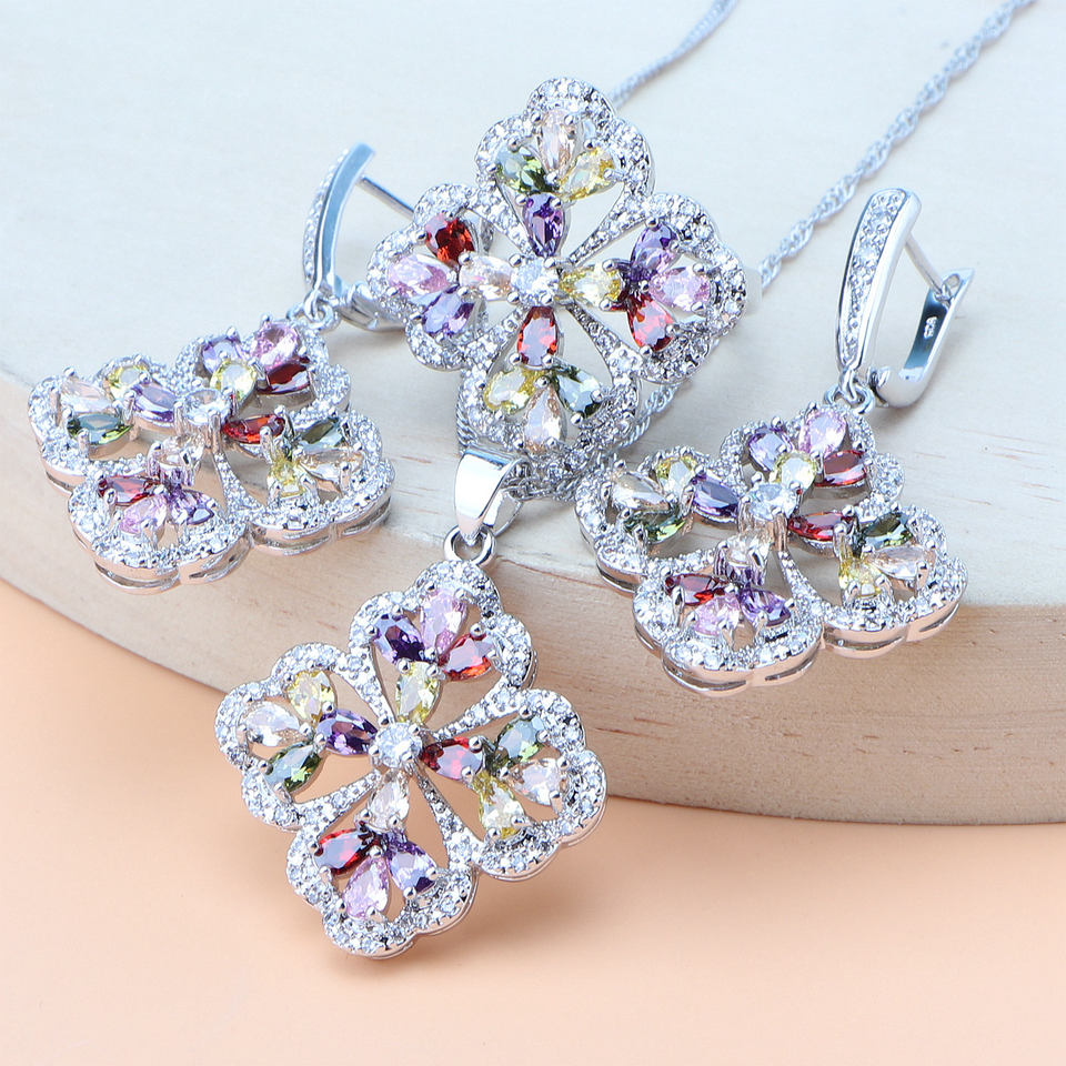 925 Sterling Silver Bridal Jewelry Sets for Women Multicolor Cubic Zirconia Wedding Earrings Ring Bracelet Pendant Necklace Set