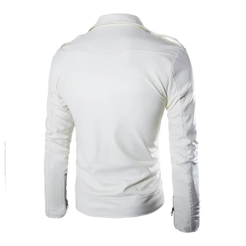 Fashion PU Leather Jacket Men Zip Stand Collar Solid Finished British Black White Punk Rock Outwear Coats