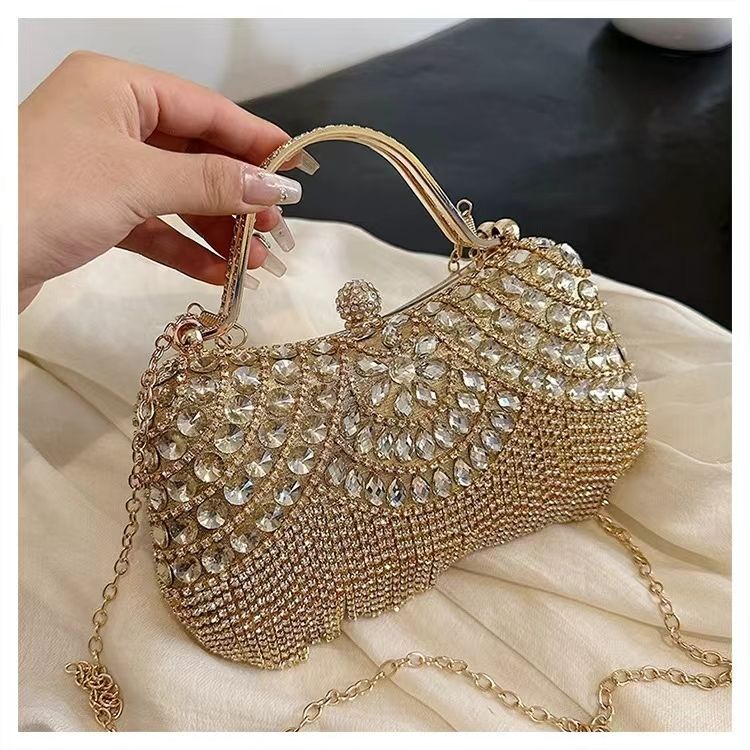Fashion Party Wedding Banquet Women Luxury Golden Tassel Chain Clutch Bag Evening Bag Rhinestone Purses and Handbag