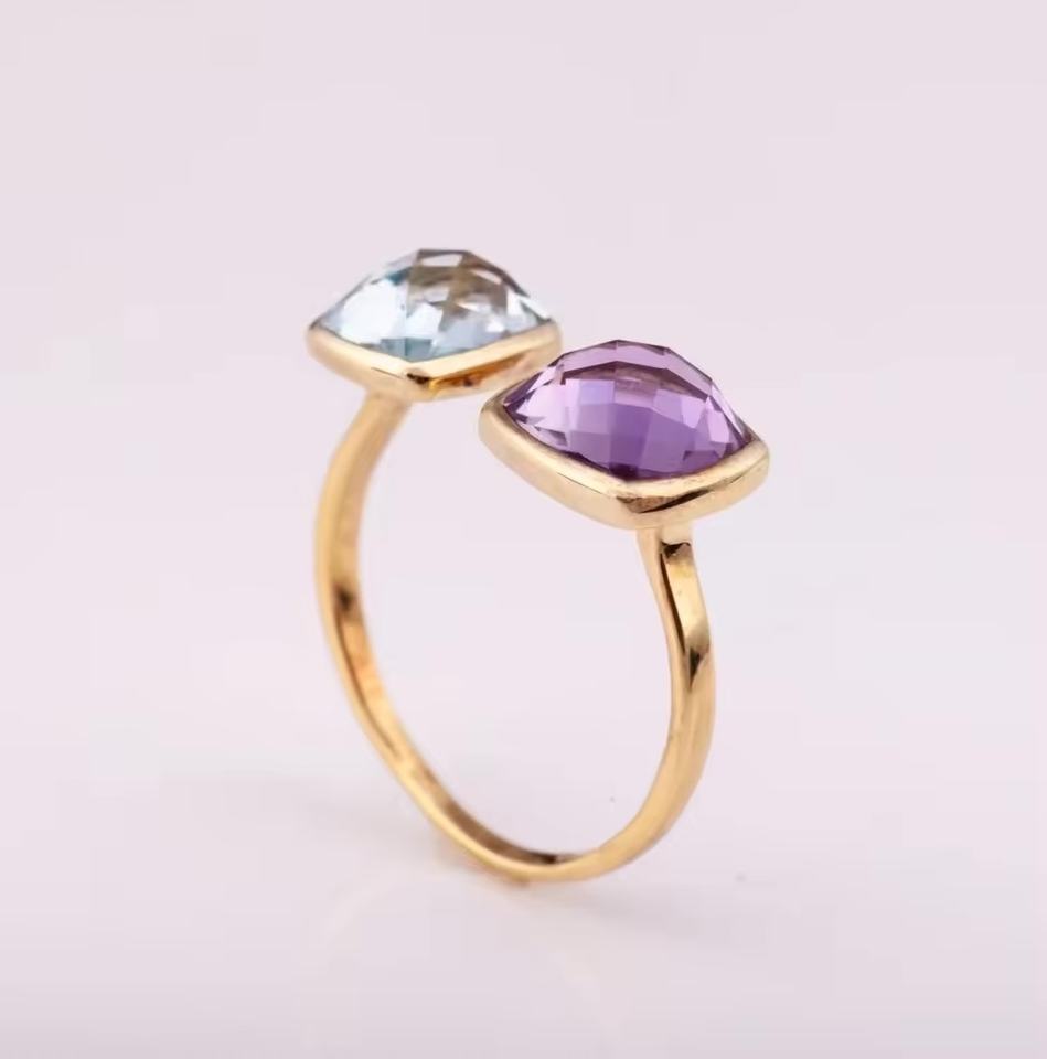 Prime Grade 925 Silver Fashion Ring 14K Gold Plated with Natural Blue Topaz and Amethyst Diamond Elegant Jewelry