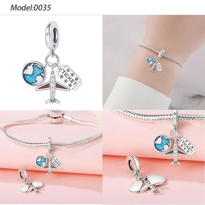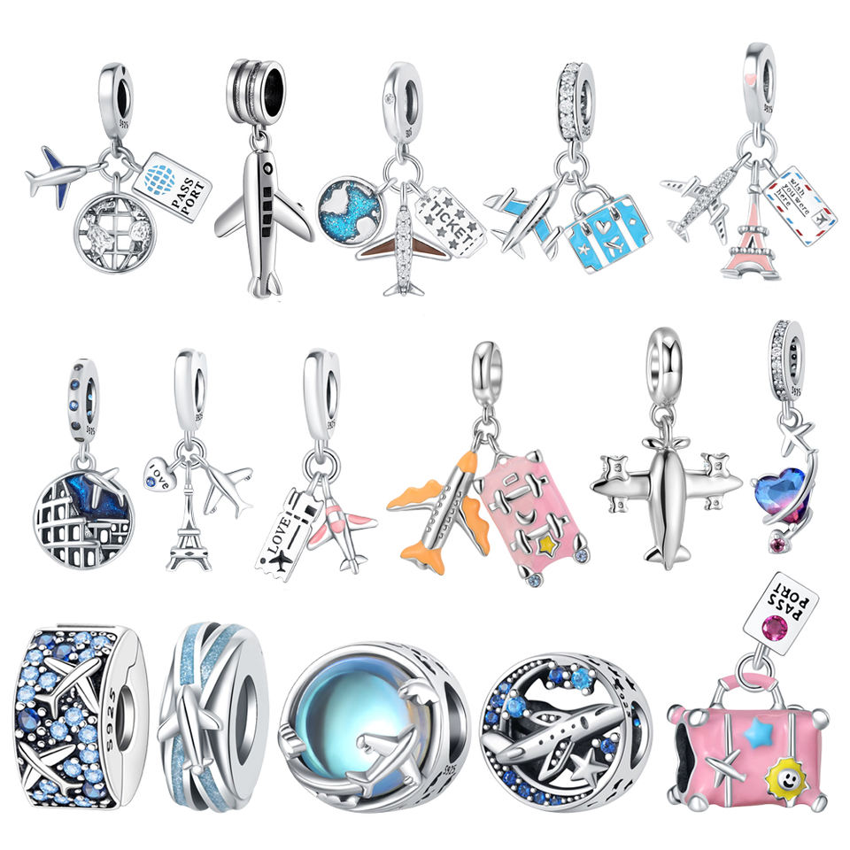 Fashion Rhodium Plated Sterling Silver Zircon Charm Airplane Global Travel Series Pendant Beads Jewelry Accessories DIY Bracelet