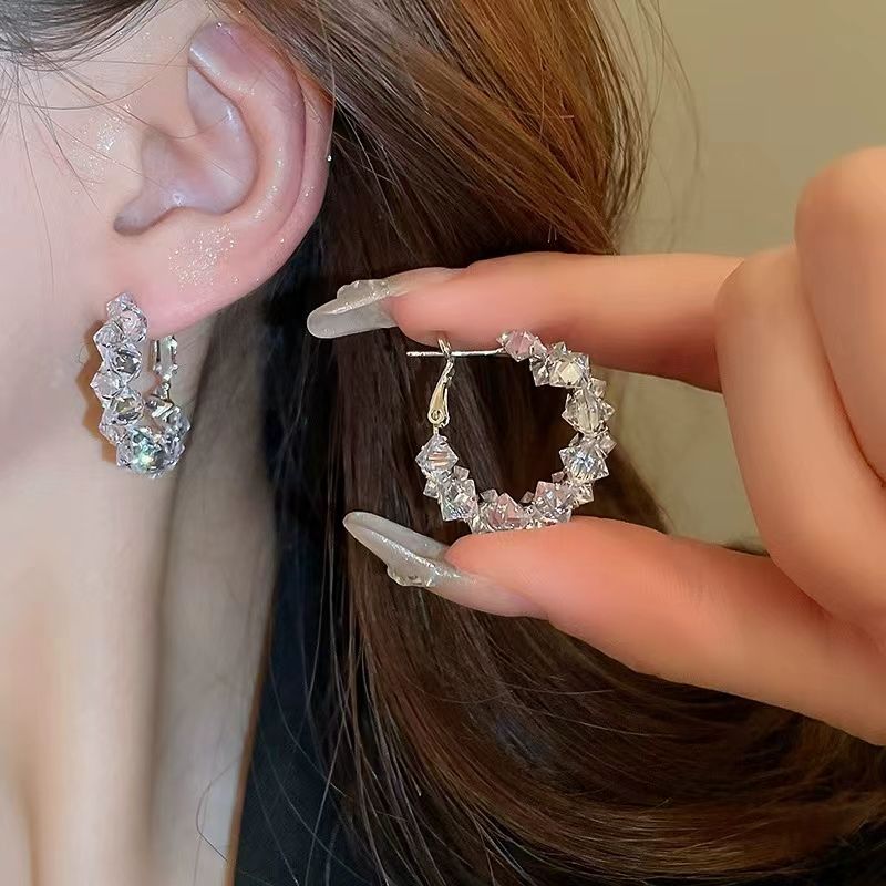 Fashion Silver Needle Bling Bling White Geometric Zircon Stud Earrings Women Cubic Zircon Hoop Earrings