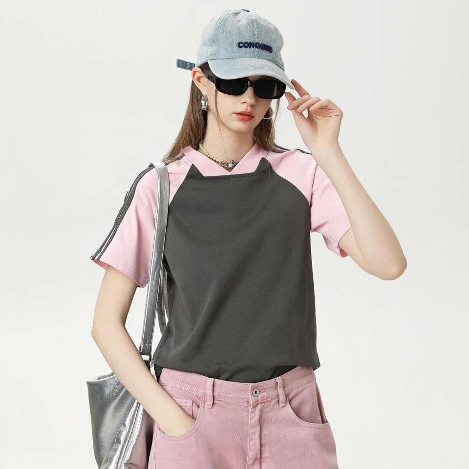 Fashion Summer Lady's V Neck Short Sleeve T-Shirts Color Matching Striped Sleeves T-Shirts for Women