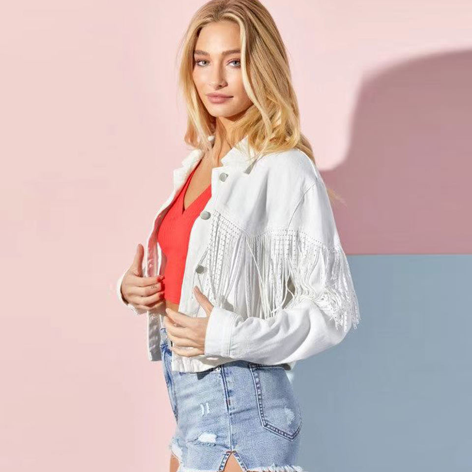 Fashion Tassel Beaded Oversized Denim Jacket Coat Women Vintage Long Sleeve Frayed Hem Female Outerwear Chic Tops