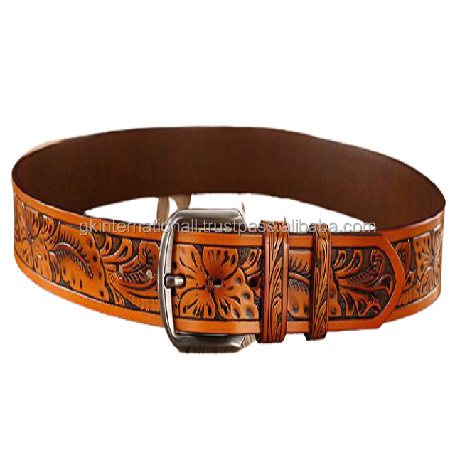 Fashion Two Tone Luxury Cowboy Western Tooled Floral Embossed Full Grain Genuine Cowhide Leather Belt for Men