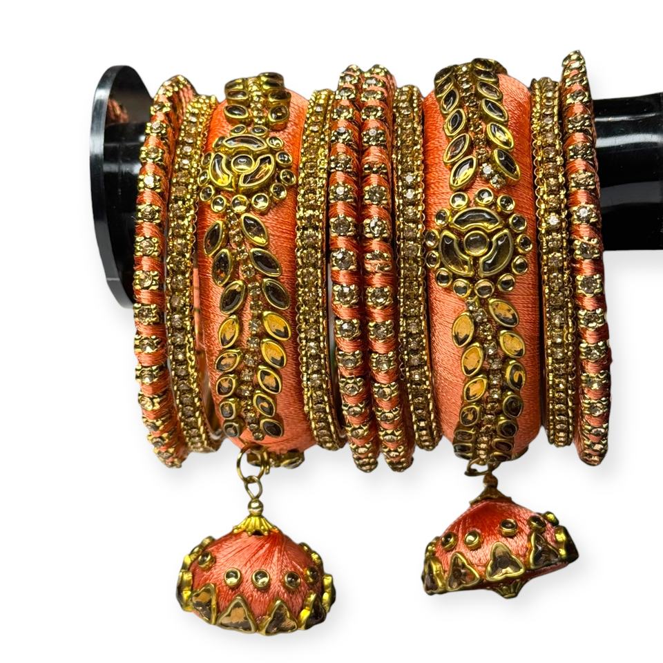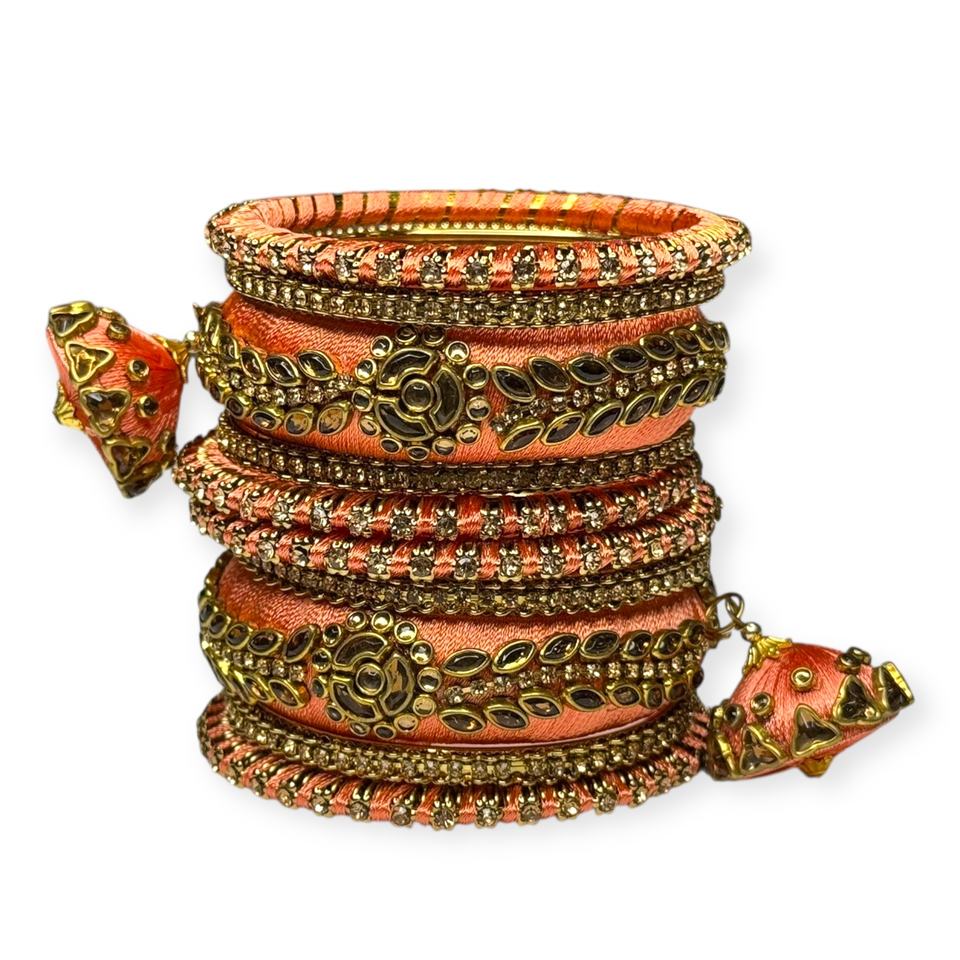 Fashion Viral Peach Gold Plated Premium Imitation Thread Pearl Bangle Set Trendy Wedding Festive Wear Stackable Bangles