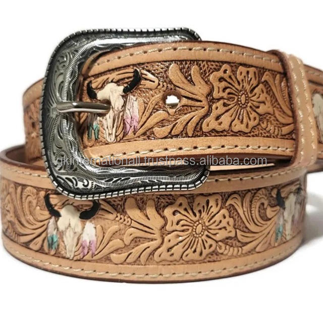 Fashion Wholesale Men's Hand Carved Embossed Western Leather Tooling Belt with Stylish Antique Brass Buckle Set