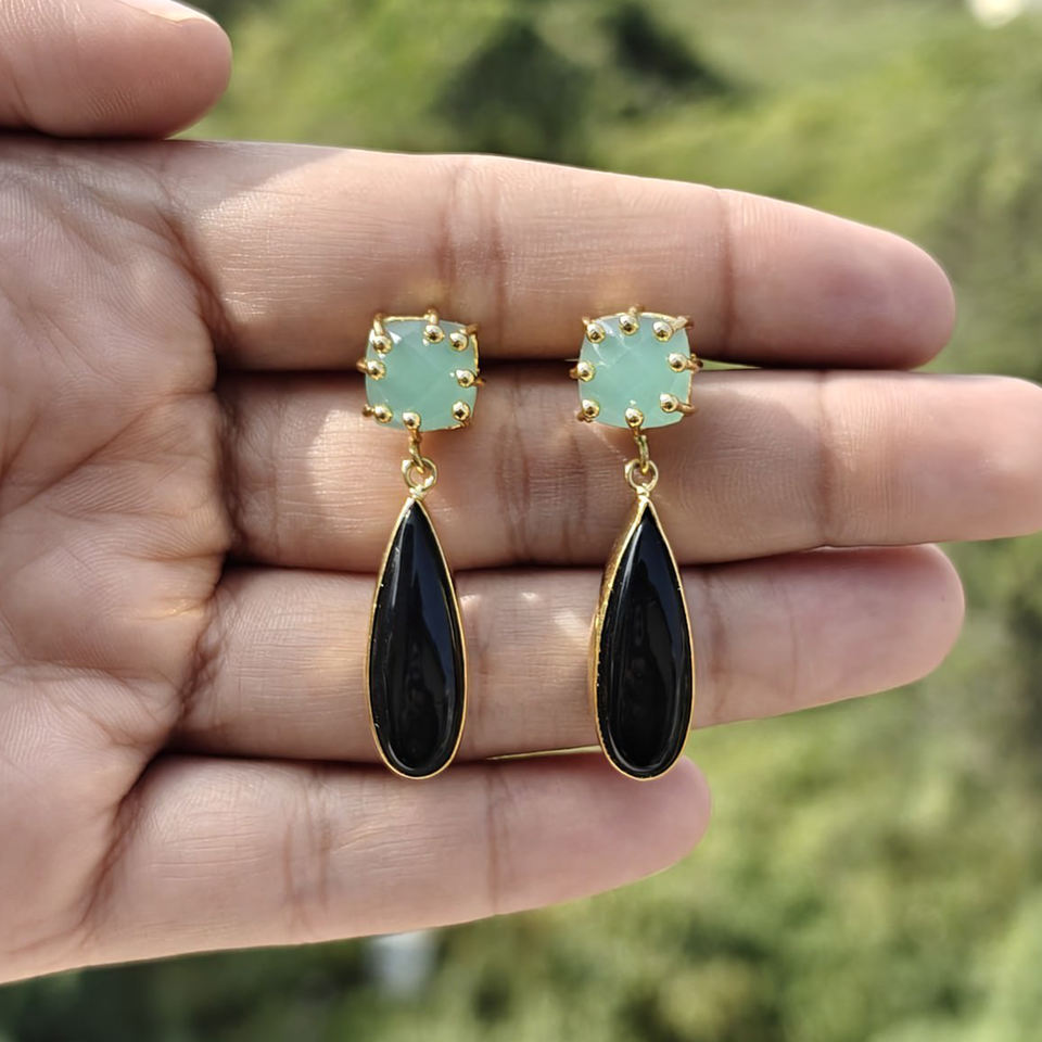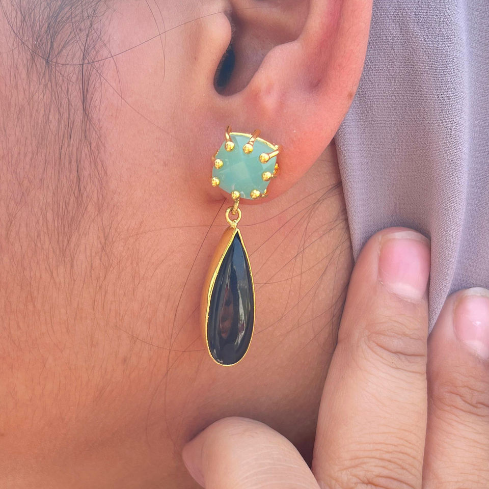Fashion jewelry natural black onyx with aqua chalcedony drop stud earring 18k gold plated chunky statement earrings for women