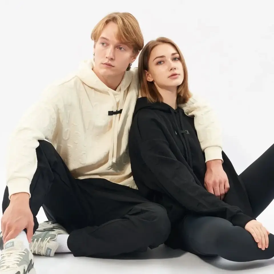 Fashionable Embossed Logo Hoodie Contemporary His and Hers Pullover Sweater with Thick Drawstring Gym Top