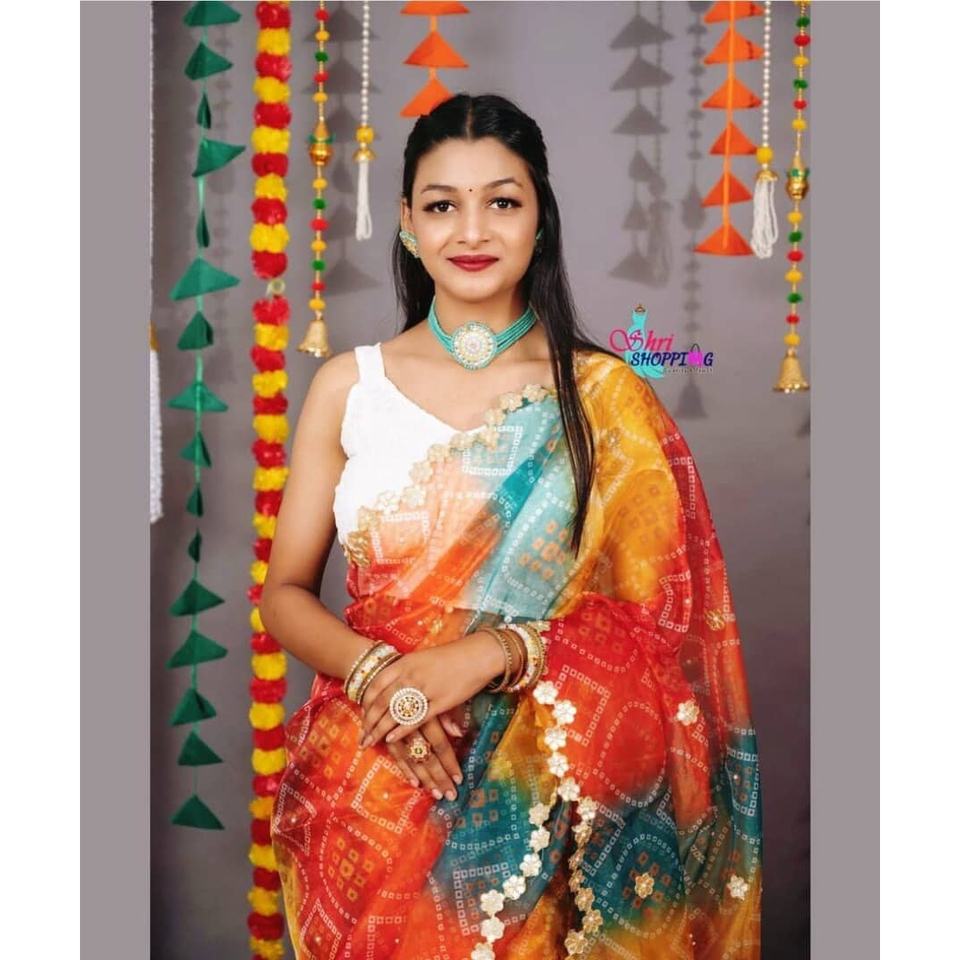 Fashionable Gota Work Printed Organza Saree with Unstitched Multi-Color Blouse for Stylish Women