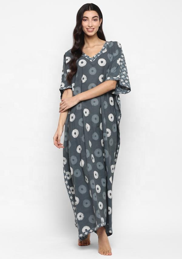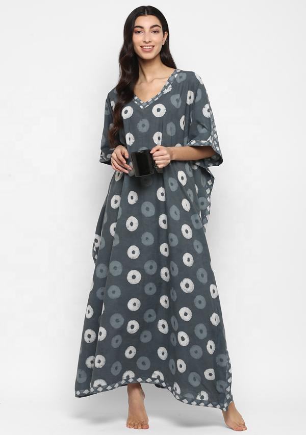 Fashionable Grey Ivory Hand Block Floral Printed V-Neck Kaftan Dress Crafted From 100% Pure Cotton Knit for Blissful Comfort