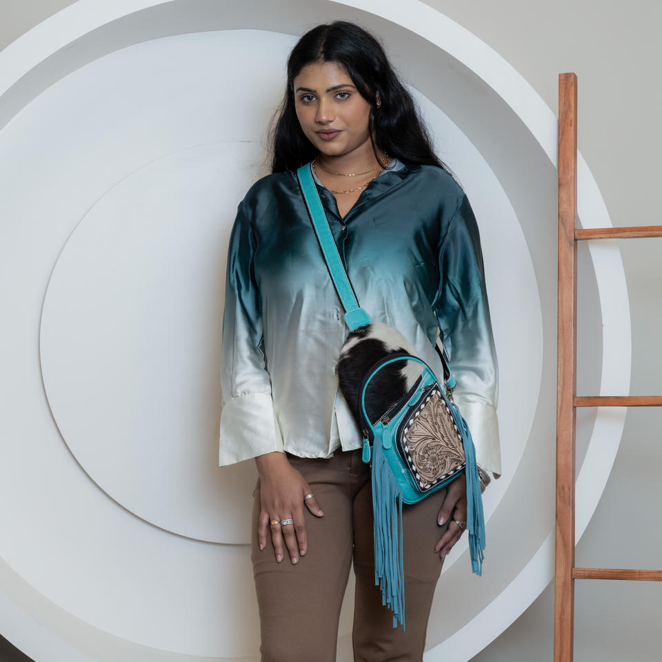 Fashionable New Hand Tooled Hair Genuine Leather Turquoise Crossbody Sling Bag Women Stylish Western Chest Bag Nylon Outdoor
