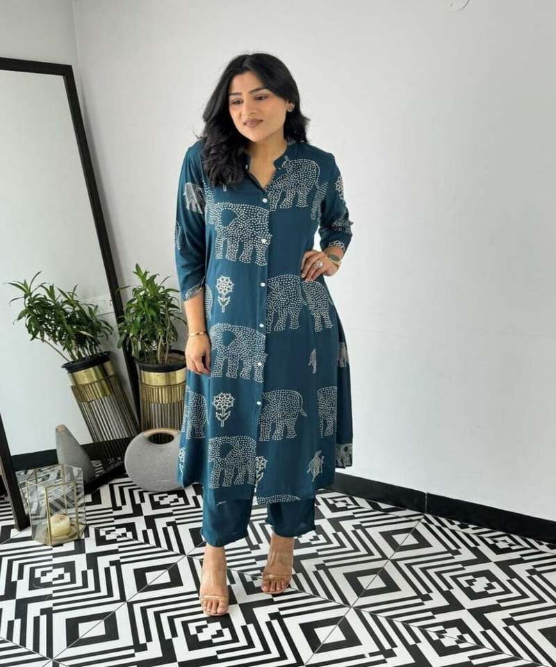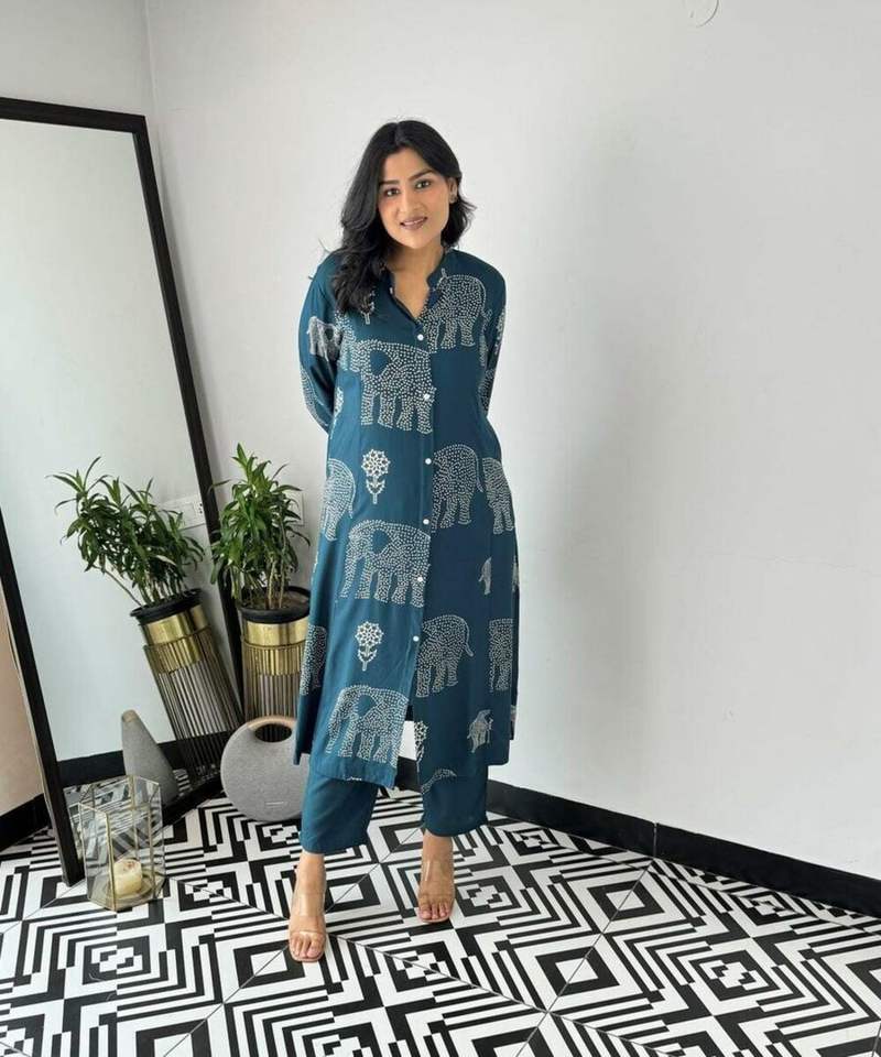 Fashionable Party Wear Festival Wear Rayon Co-ord Set kurta with Playful Floral Print and Ruffle Accents.