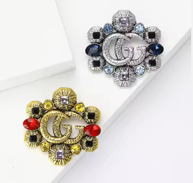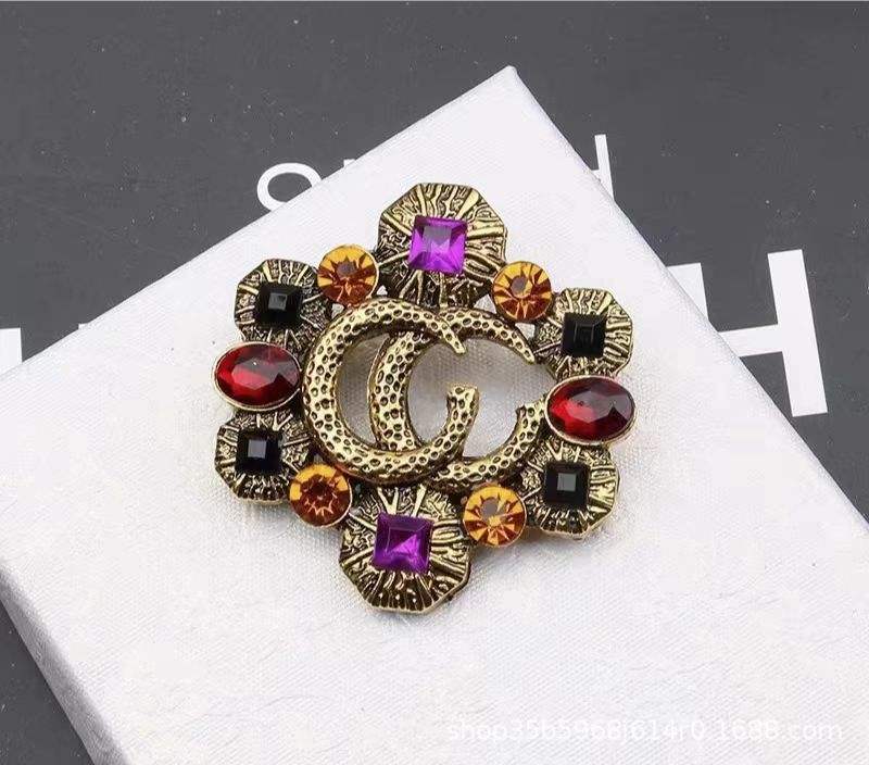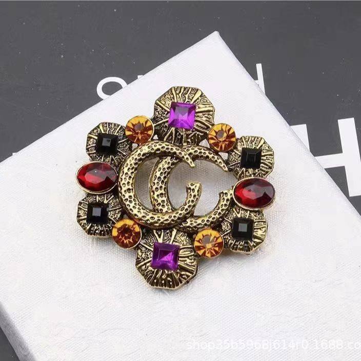 Fashionable Retro Alloy Gold Plated Brooch Hollow Colored Crystal Zircon Inlaid Double G Letter Design Wedding Engagement Gift