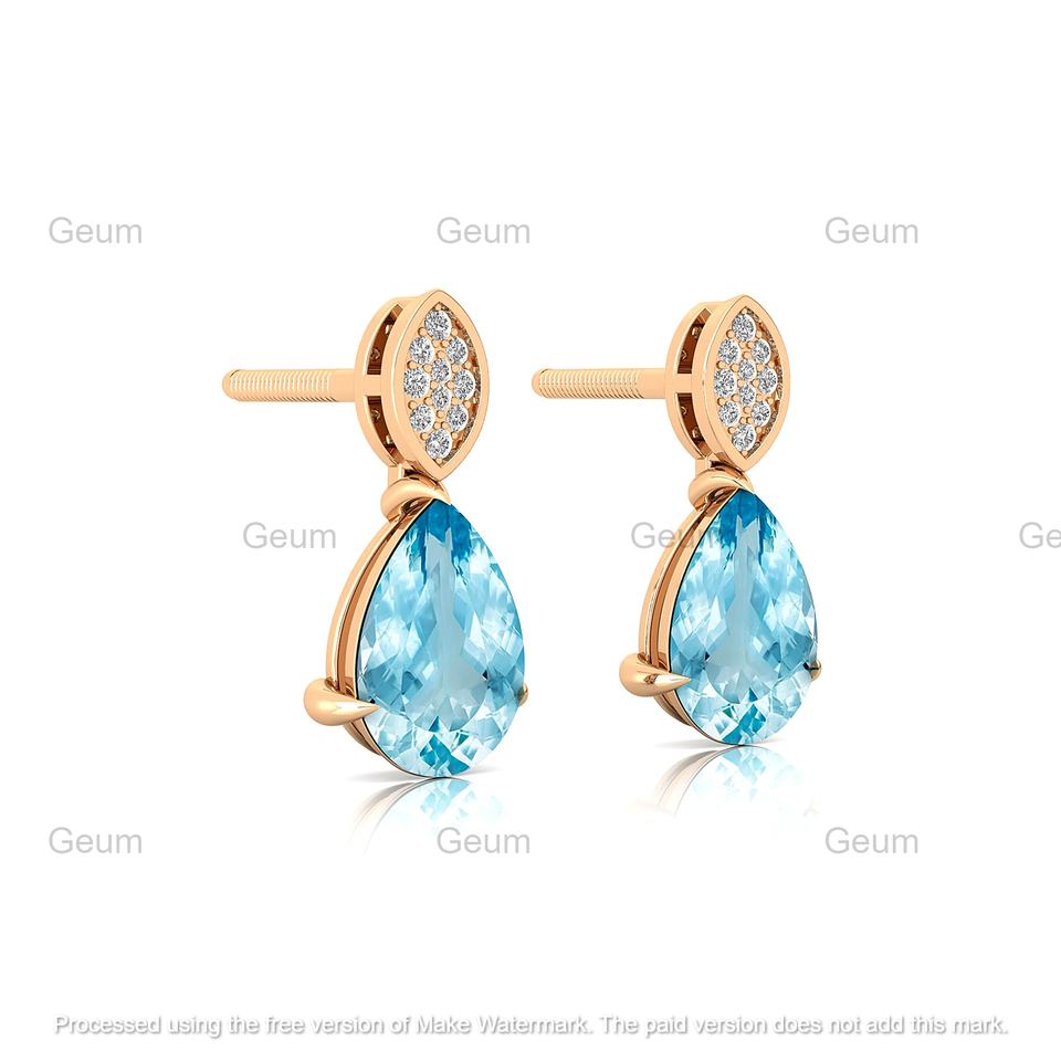 Fashionable Unique Tear Drop Design Dangle Drop Earrings in 14K Solid Gold Adorned With Real Diamonds & Lab Aquamarine Gemstone