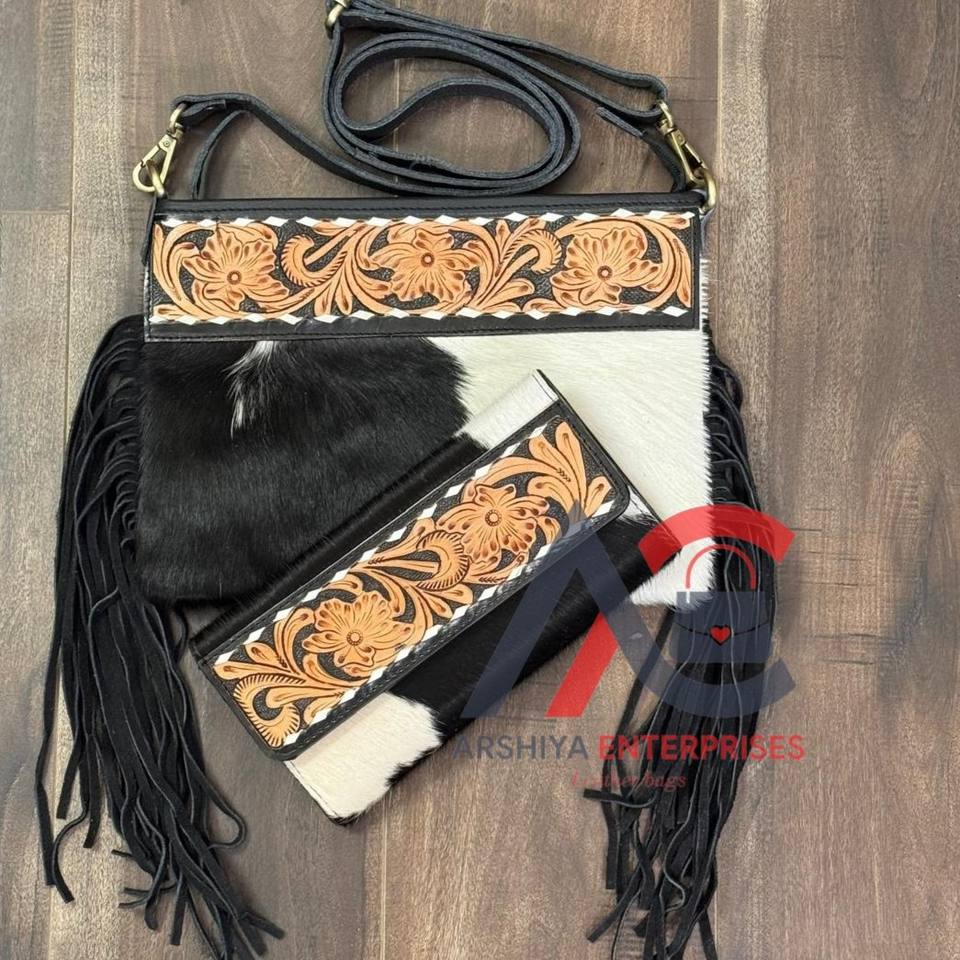 Product name:Hand Tooled Leather Cowhide Fringe Bag with Wallet Set