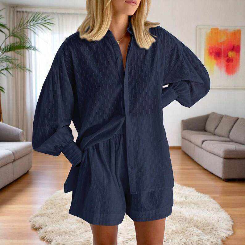 Fashionable Women Jacquard Shirt and Shorts Set Smart Long Sleeves Stylish Summer Vacation Clothing Outfit