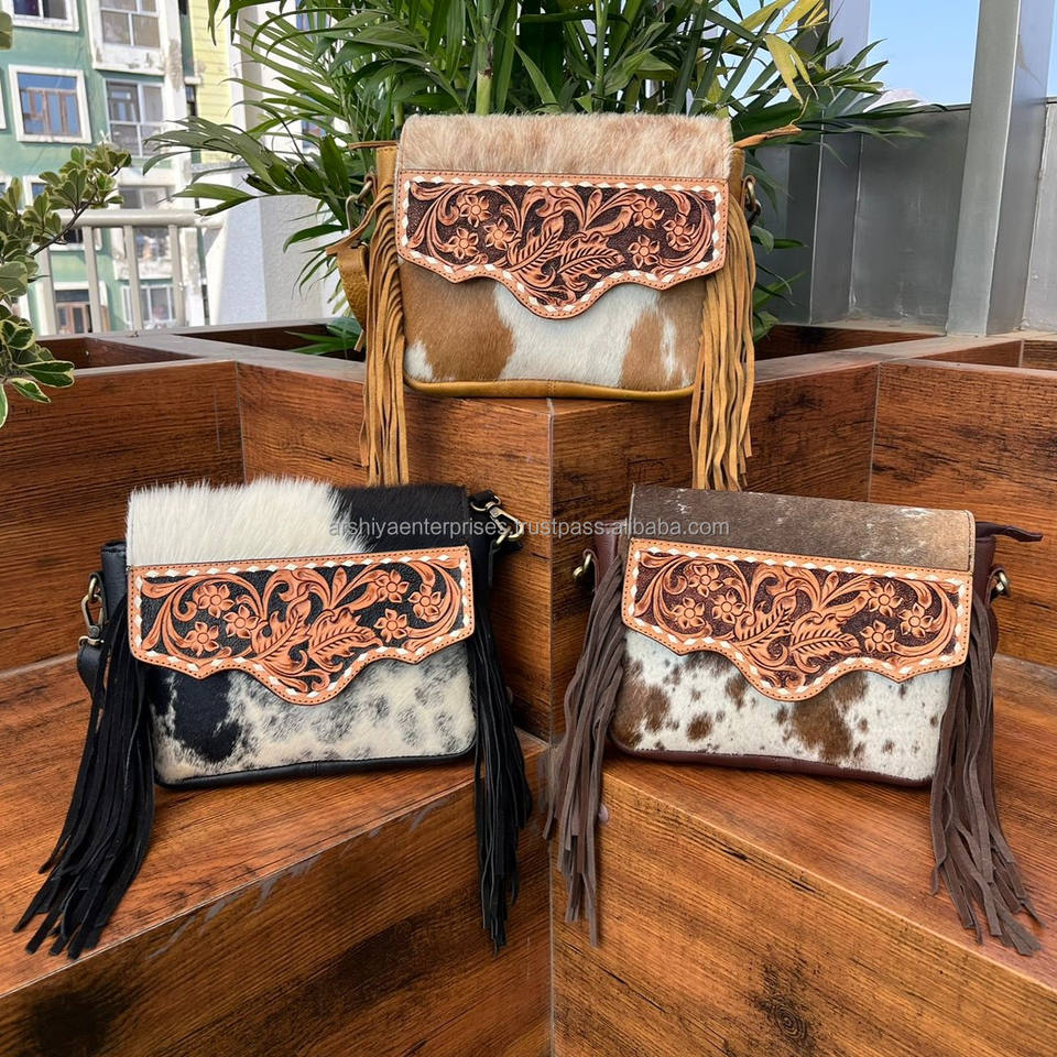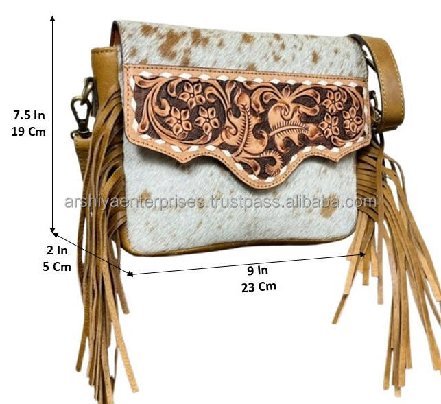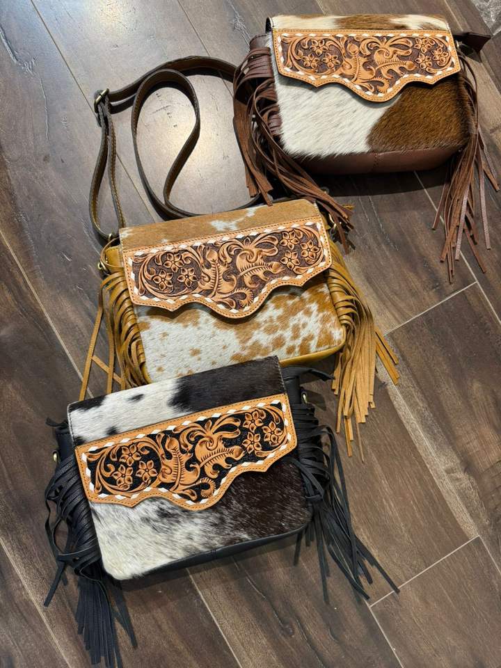 Product name:Hand Tooled Cowhide Crossbody Fringe Bag