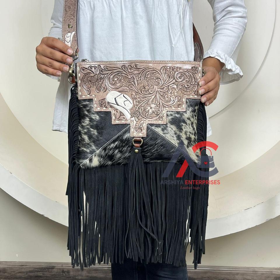 Fashionable Women's Hand Tooled Leather Fringe Crossbody Bag High Quality Genuine Leather Shoulder Bag Luxury Designer Handbags
