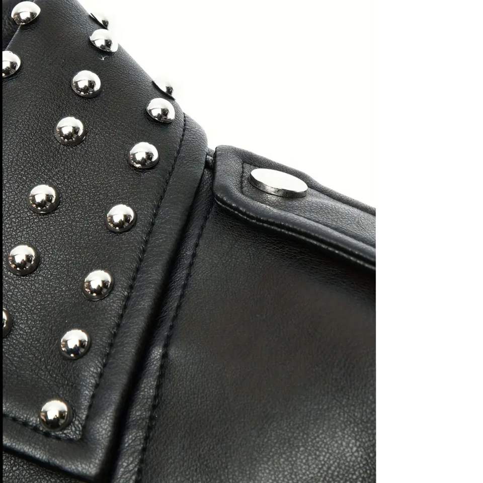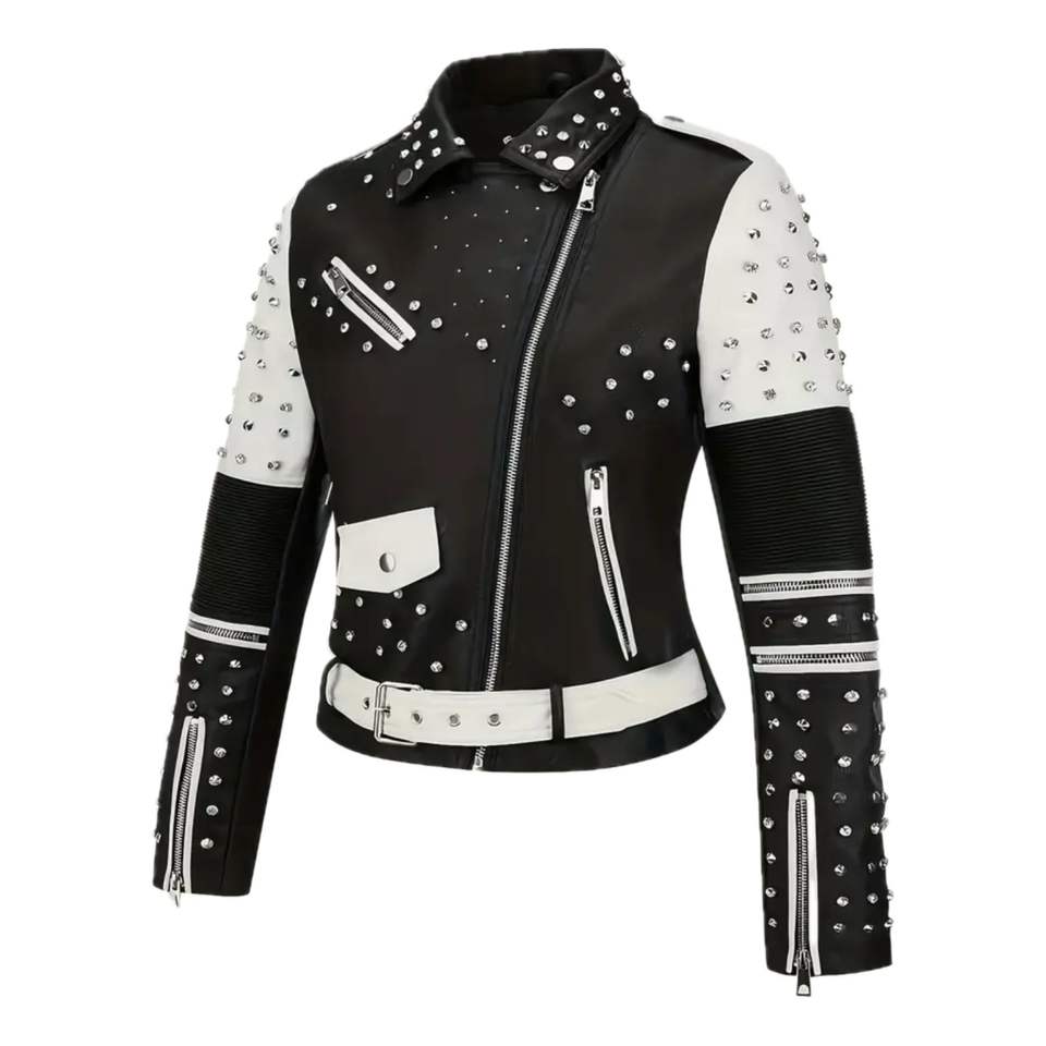 Fashionable black and white contrasting rivet motorcycle leather jacket with multiple pockets, slim fit rock punk style jacket