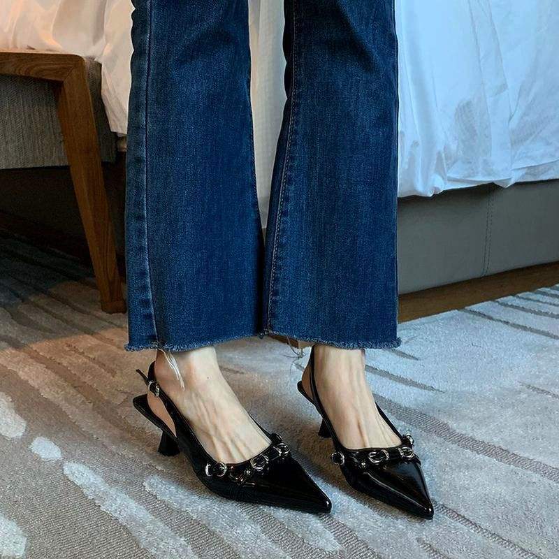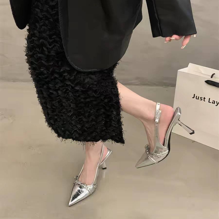 Fashionable Rhinestone Slip-On Patent Leather Black Silk Pointed-Toe Stilettos with Sandals for Women Party Occasions