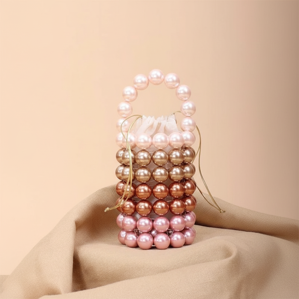 Fashionable vertical bucket style bag featuring multi-toned pink and bronze gradient pearl rings, available at wholesale prices.