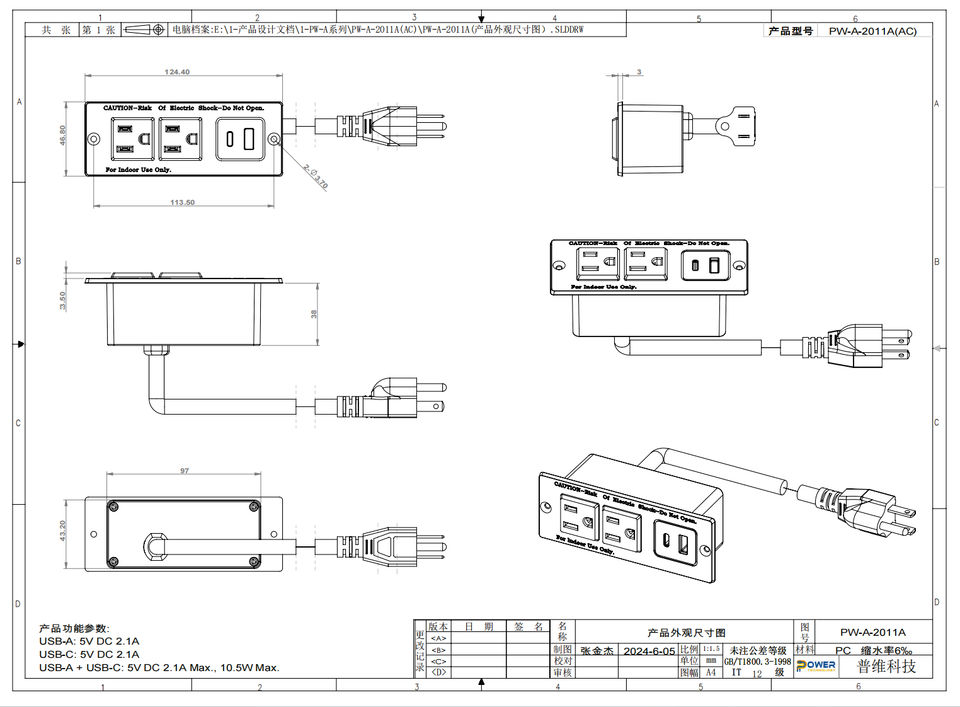 Fast Charging Made in Viet Nam 125V Recessed US Power Strip PW-A-2011A-PD with USB and Type C Charging Port for Table/Sofa/Desk
