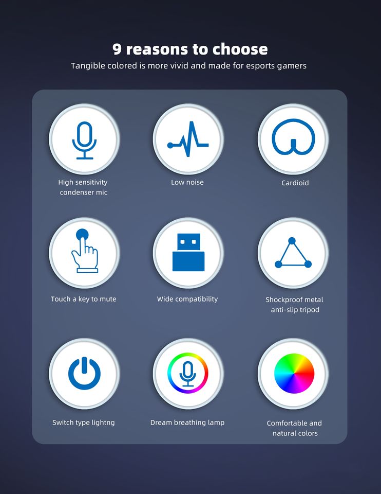 Condenser Microphone, USB Microphone, With RGB lighting, Portable, Noise CancellingFeature